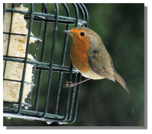 Fortunately, the ever resourceful Robin has learned how to access the peanut cake in a cage designed for finches and tits - and to keep out squirrels. It took the Robin many weeks of fluttering and vain attempts before it hit on the right technique - but now it's a master!