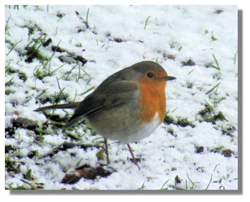 This Robin looks a bit puzzled by the ground being covered by snow, making it difficult to find anything to eat in what it regards as "its territory".