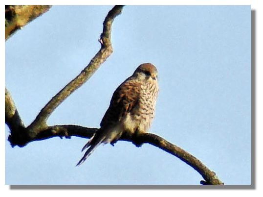 Kestrels are often seen hovering above hedgerows or embankments beside motorways, seeking out their prey with sharp eyes - and claws. But they also regularly perch on posts or walls - or as in this case, the bare branches of dead trees. Numbers of kestrels have declined, probably due to more intensive farming.