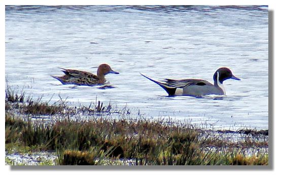 Pintails are slightly larger than the more common Mallard duck and many of the birds found in Scotland and the UK come from Iceland to over-winter, with about 28,000 individuals escaping the harsher climate further north. The distinctive plumage (and two elongated tail feathers) is sported by the male until after the breeding season. Then the moult between July and September, when and the colouring becomes similar to that of the female.