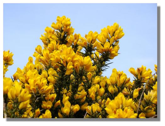 There are Gorse flowers to be seen at all times of the year, but they burst forth with lots of blooms particularly from March to July. They produce a strong scent - described as a mixture of vanilla and coconut. Their ability to flower at any time of year (though not in quite such profusion) and that gave rise to the proverb: "When gorse is out of bloom, kissing's out of season".