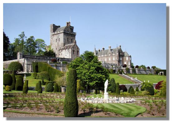 This is the view of Drummond Castle from the gardens. The clipped trees and the low hedging along the paths and flower beds produce different views of the castle every few paces. King James IV gave the first Lord Drummond permission to build a stronghold on a rocky outcrop on the edge of Strathearn in 1490. The original tower keep was modified and enlarged (see the building to the left) but the lower floors are those built by the first Lord Drummond. The 4th Earl of Perth (the Drummonds moved up in the world over the centuries) built a mansion house beside the original castle (see the building on the right of the picture above).
