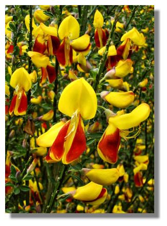 The small, pea-like flowers of Broom (Cytisus is its botanical name) are most often seen in yellow. But they also come in cream, orange or red, or a mixture of red and yellow. The graceful branches are covered in these bright flowers and the tiny leaves don't get in the way at all.