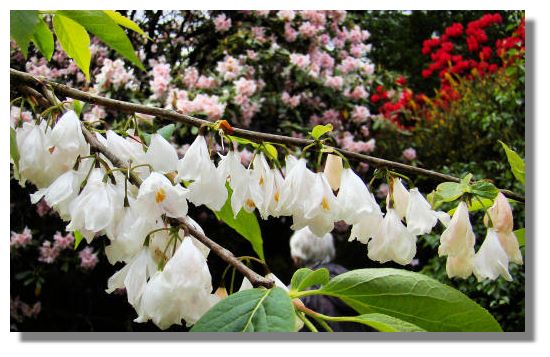 The bare branches of the large deciduous Halesia become covered in the spring by clusters of white, bell-shaped flowers, about an inch across. Understandably, Halesia's popular name is the "Snowdrop Tree".