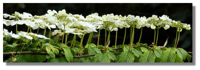 Viburnum comes in a huge diversity of foliage, fruit and flowers and this one produces its blooms on long stems that march along its branches like soldiers on parade!