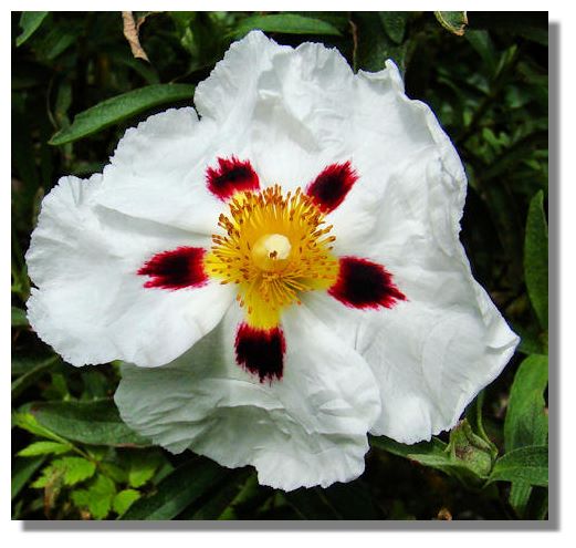 The saucer-shaped, papery flowers of Cistus (also known as the Sun Rose) can be several inches across, but last for little more than a day. But they are produced in profusion from June to October. This particular example (Cistus lodonifer) is from my own garden.