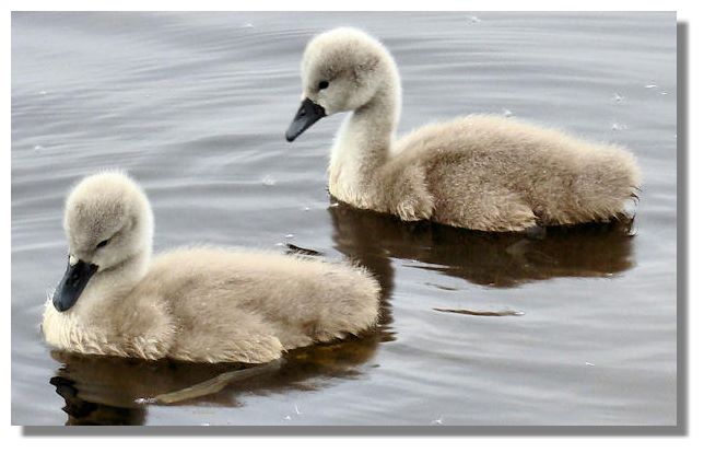 Young birds always look so attractive, no matter what variety they are. And none more so than cygnets. These young swans grow up fast - even though they have to feed themselves as soon as they hatch. Their parents certainly protect them and show them where to find food - but will compete with their offspring for choice items if necessary. These little balls of fluff will be nearly as big as their parents in just a few months time - just from eating largely aquatic plants (and the occasional pieces of bread provided by us humans). These two cygnets were part of a family of six.