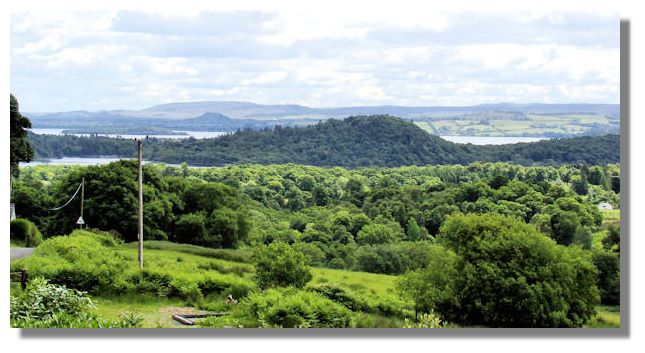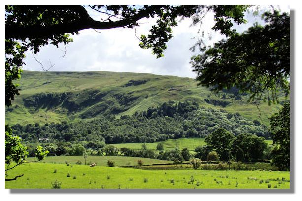 The Campsie Fells (hills) are visible from the windows of my house. They are not very high, less than 1,900 feet, but rise sharply from the broad valley of the river Clyde (and can be seen clearly from tall buildings in the centre of Glasgow). This picture of the Campsie Fells, however, was taken from the northern side, near the little village of Fintry in Stirlingshire. It's when you see all that greenery that you appreciate just how much rain falls in this part of the country!
