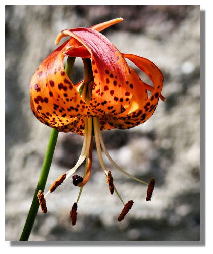 The orange flowers with purple spots and that distinctive shape are typical of the "Turk's Cap" lily. The flowers reach a height of about four feet, with large numbers of flowers on each stem, making a striking display.