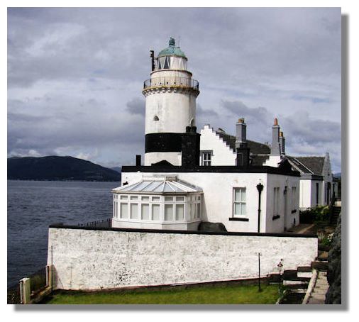 With its long shoreline, Scotland has many lighthouses, some of them with many stories to tell. The Cloch lighthouse is on the shore of the Firth of Clyde, at the point where the river turns from flowing west to a southerly direction into the estuary and then the open sea. It was thus a well-known landmark for many who left Scotland to emigrate to around the world - and a welcome sight for travellers returning to Scotland. The name Cloch (you need to be a Scot - or maybe German - to be able to get the "och" properly!) comes from the Gaelic word for stone. It was built in 1797 and was partly the work of Robert Stevenson of the well-known lighthouse-designing and novel-writing family. It warned ships of The Gantocks, a dangerous rocky reef directly west of the point.
