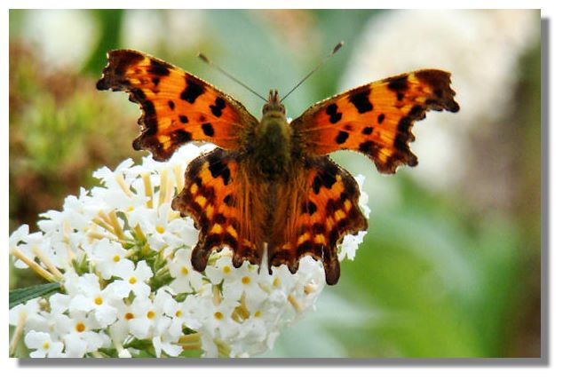 Over the last few years I've managed to get photographs of Comma butterflies by travelling over to the east of Scotland where they have been seen increasingly in Fife, Angus and in areas around Edinburgh. But it was a great surprise to find one almost on my doorstep in Drumpellier Country Park in North Lanarkshire. This public park has been much improved in recent years and earlier this year a group of white-flowering buddleja was planted in a garden area. Common garden butterflies have found there way there - and so did this Comma. Until recently, the Comma had been largely confined to southern England. Of course, it seems that in a year which has been a disaster for many butterfly species, reports of Comma sightings have never been higher.