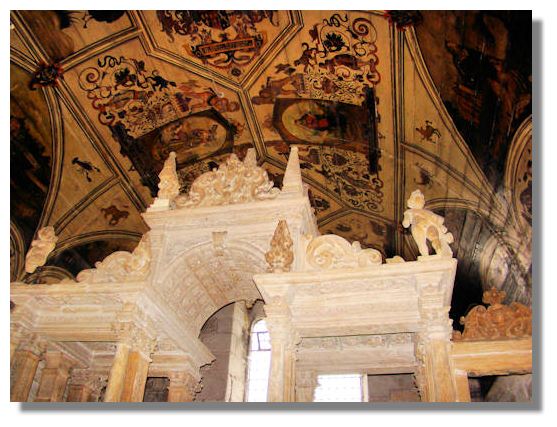 The Skelmorlie Aisle may not be all that large, but Sir Robert Montgomerie created a richly carved Renaissance canopied tomb in undressed marble above the burial-vault entrance. It reaches almost to the roof and nearly touches the timber arched ceiling, which was richly painted with rustic scenes, signs of the zodiac, quotations from the bible - and the several panels with the Montgomerie coat of arms. Even though the paintings were applied in 1638 (signed by the painter, J S Stalker), they have survived well to the present day.