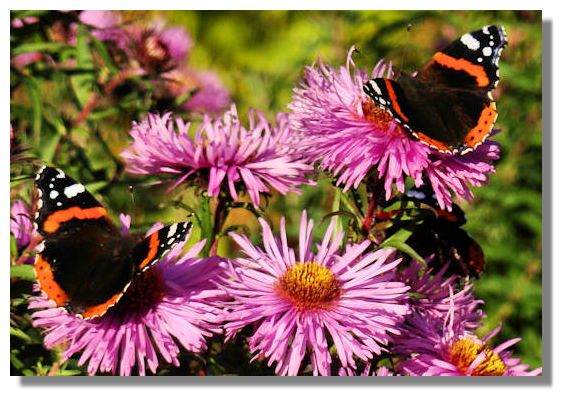 Michaelmas Daisies are part of the Aster family, a daisy-like herbaceous perennial. Michaelmas, the feast of St Michael, occurs on 29 September and Michaelmas Daisies are at their peak around that time. As it is one of a diminishing number of flowers in bloom at this time of year, it becomes a useful source of nectar for butterflies such as these Red Admiral butterflies.