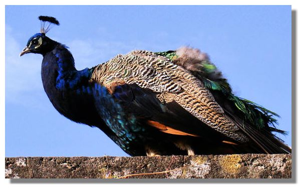 Peafowl consist of two species of spectacularly plumaged pheasants, and the male peacock is famous for its iridescent blue-green or green coloured plumage and huge, elongated tail. This one is starting to grow its new plumage after moulting in the late summer. It was strutting on a wall at Drummond Castle in Perthshire and so its lack of tail feathers is perhaps not too obvious.