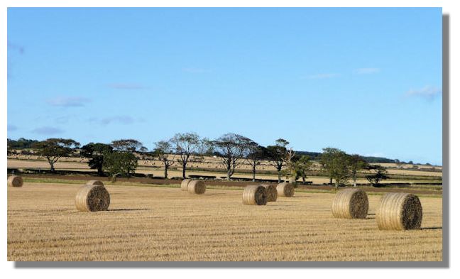 After so much rain in August and September, farmers struggled to harvest the cereal crops. Eventually, somehow, they have managed to complete the task and the round bales of the stalks dot the landscape in Fife. In the old days, there would have been long lines of ten or twelve sheaves propping each other up in "stooks" - great for kids to crawl through!