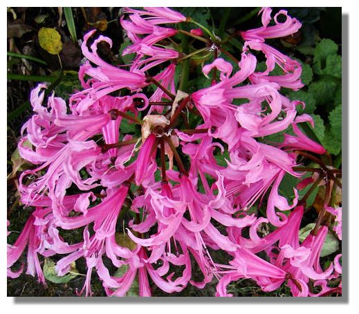The pink trumpets of Nerine create a bright splash of colour in the late autumn in Scotland. These bulbous perennials originate from South Africa, but "Nerine bowdenii" are hardy enough for the Scottish climate. The wavy petals of the trumpets come in clusters, on graceful stems, with individual flowers about 1½" (4 centimetres) across. The blooms are long lasting and the leaves - which follow on afterwards - don't die down until the spring.