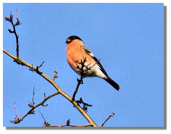 The Bullfinch is about the same size as a House Sparrow, but often looks bigger than that with its large head, thick neck and plump body. The adult male (seen here) has rose pink chest and the upper feathers are grey. It is a shy, secretive bird and feeds on buds and berries and can often be seen in springtime tucking into the buds of emerging cherry blossom.