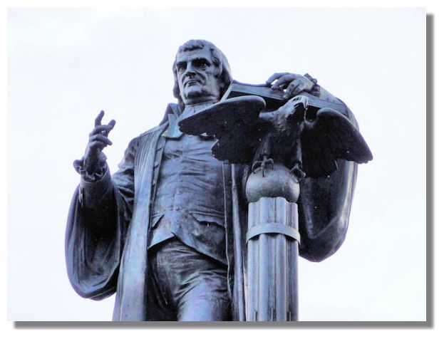 An ancestor of John Witherspoon (1723-1794) was John Knox, who had been a major force in the Reformation of the church in the middle of the 16th century. Witherspoon also became a minister. He was a brilliant orator and was "head hunted" by a number of churches in Scotland (and abroad) before moving to Paisley - where this striking statue is located. He was persuaded by letters from Benjamin Franklin in 1768 to become president of the College of New Jersey (later Princeton University). Witherspoon was soon supporting the independence fight in America and became what in today's politics would be regarded as a senator. When some of the delegates from the thirteen American colonies gathered to decide whether to break completely with Britain expressed hesitation, it was Witherspoon who urged them to sign the Declaration of Independence, saying "There is a tide in the affairs of men, a nick of time. We perceive it now before us. To hesitate is to consent to our own slavery." After leaving Congress in 1782, Witherspoon was involved in the rebuilding of Princeton College (destroyed during the war). He was its President from 1768 until his death in 1794. For more on Witherspoon, see Famous Scots - John Witherspoon.