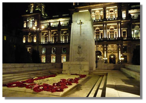 The cenotaph war memorial in George Square, Glasgow, in front of the City Chambers, is covered with wreaths of poppies which were laid during the service of remembrance earlier this week. There is a carving on the obelisk of St Mungo, the patron saint of Glasgow. In front of the granite memorial is a great flat slab with a carving of a fern leaf and the word "Pax" (peace) inscribed on it. The City Chambers (essentially the city hall) at this time of year is lit up, highlighting the elaborate carvings of this 19th century building.