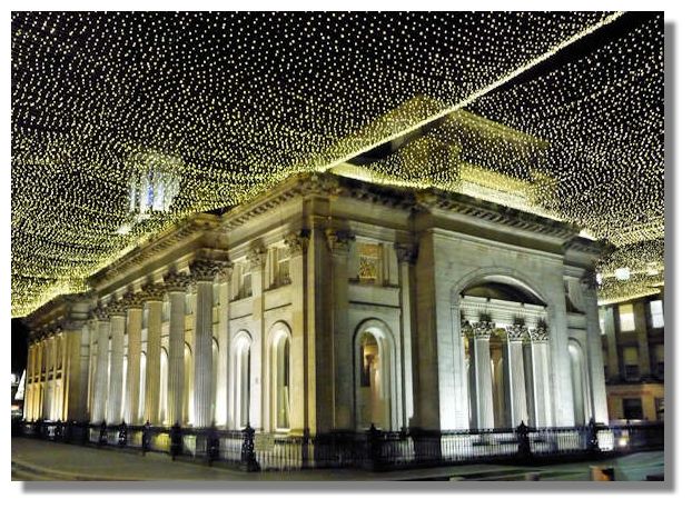 The Gallery of Modern Art in Glasgow is usually lit up at night but joins in the festive season with additional elements such as the Christmas tree. The magnificent building began life in 1778 as a palatial Tobacco Lord's house with a large garden. Later, when it became the Royal Exchange for the city merchants, the building was refaced and fronted with a giant portico of Corinthian columns and the cupola added above. It became the Stirling's Library in 1954 and was refurbished to house the city's contemporary art collection in 1996.