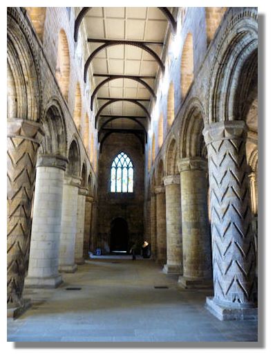 In addition to King Malcolm III and his wife Margaret, a number of other kings, queens, princes and princesses were buried in Dunfermline Abbey. Three of King Malcolm III's sons - King Edgar (1107), King Alexander I (1124) and his queen Sybilla and King David I (1153) were all interred there as was David's grandson, King Malcolm IV (in 1165). Later, King Alexander III (1286) and his queen (another Margaret) were buried at Dunfermline. This is the nave of Dunfermline Abbey with its soaring columns - the roof is part of a 19th century renovation.