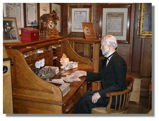 Carnegie moved into the iron industry and during the Civil War (1861-1865) he expanded the railways, using iron for bridges instead of wood. Investments in oil followed, then his first steelworks in 1867 (one of the first in America). In the 1880s he was the leading iron and steel producer in the country. But by 1900, having decided that "The man who dies rich dies in disgrace" he sold out to the United States Steel Corporation and set about distributing his vast fortune. He set up 2,500 libraries in Britain and North America and all four of the older Scottish universities received bequests, as did Carnegie Mellon University. His home town of Dunfermline was not forgotten either ("the most sacred spot to me on earth"). By the time he died in Massachusetts in 1919, he had made bequests amounting to over $350 million during his lifetime. The picture above is a replica of one of Carnegie's offices which has been created in the museum extension adjoining his birthplace.
