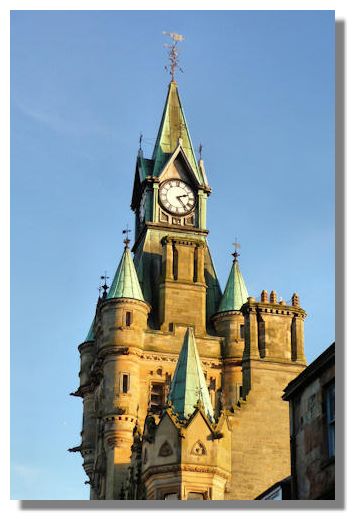 The City Chambers in Dunfermline has been described in an architectural guide to Fife as "an elaborate French Gothic concoction with Scottish overtones, its Fettes-type clock steeple surging up from its narrow corner site to celebrate the mercantile prosperity of 19th-century weaving." The Fettes referred to in this description is a famous private school for boys in Edinburgh.
