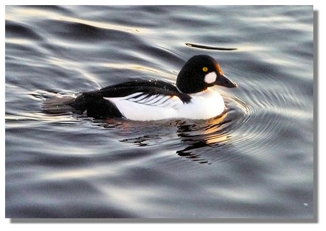 The Goldeneye duck gets its name from that distinctive yellow eye - though the white patch below the eye of the male bird is even more prominent. The birds nest in trees several metres off the ground and at a day old the chicks (often 8 to 11 of them) jump to the ground where the female marches them off on a perilous journey to a loch which is often a substantial distance from the nesting site. Once there, the young birds dive and feed themselves, becoming independent after about 50 days - and taking to the air for the first time about a week later. In winter, the birds move south - returning to the Lowlands of Scotland and further south.If you want to look back at earlier editions of this Colour Supplement, there is an Index Page