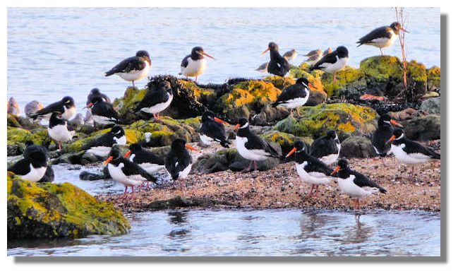 Peering over a wall beside Blackness Castle, I came across a large party of mainly Oystercatcher birds. They always look incongruous with those large orange-red bills - useful for digging up not just shellfish at the seashore but also worms inland in farmland. In winter, many develop a white "chin-strap" and their loud piping "kleep-kleep" call can often be heard long before they are seen. They often gather together like this in winter time on coastal shallows and estuaries such as the Firth of Forth. In winter, resident numbers of around 80,000 in the UK swell to over 340,000 as birds from Scandinavia migrate here.