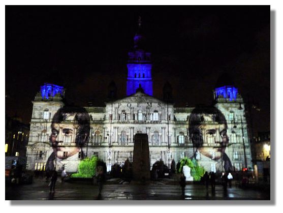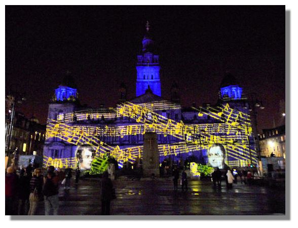 The City Chambers (roughly equivalent to "City Hall") in Glasgow was literally the backdrop for a 15-minute "slide-show" illustrating the life of the poet. The moving images were accompanied by a soundtrack peppered with songs and poems by Burns.