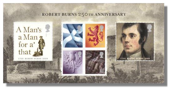 The celebration of the 250th anniversary of the birth of Robert Burns has prompted many people and organisations to mark the event in many different ways. In Scotland, the anniversary has given rise to the "Year of Homecoming" which was officially launched on 25 January. The Royal Mail has produced this special set of stamps to mark the occasion. One depicts the famous Alexander Naismith portrait of Burns and the other quotes from the bard's most famous and enduring poem "A man's a man for a' that". Burns is the only person outside the Royal Family to feature in three special stamp issues (1966 and 1996 and now in 2009).