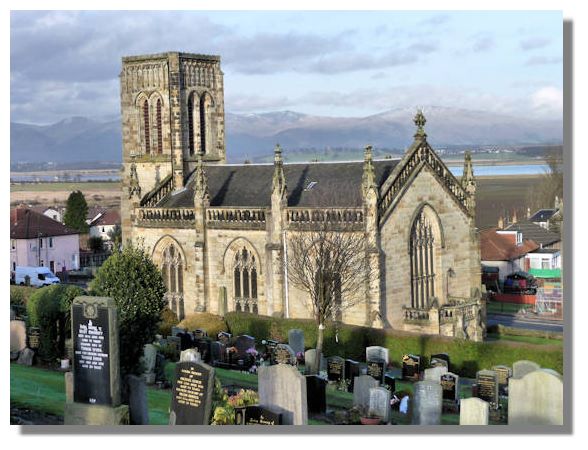 Dunmore is just off the A905 road between Falkirk and Stirling and about a mile away, on the same road, is the ancient village of Airth. The present parish church, seen here, dates from the 1820's and has a large graveyard which lies on a slope. Behind the church is the River Forth and beyond that the Ochill Hills, with a light covering of snow. The ruins of a much older church (dating from the 12th century) can be found beside Airth Castle.