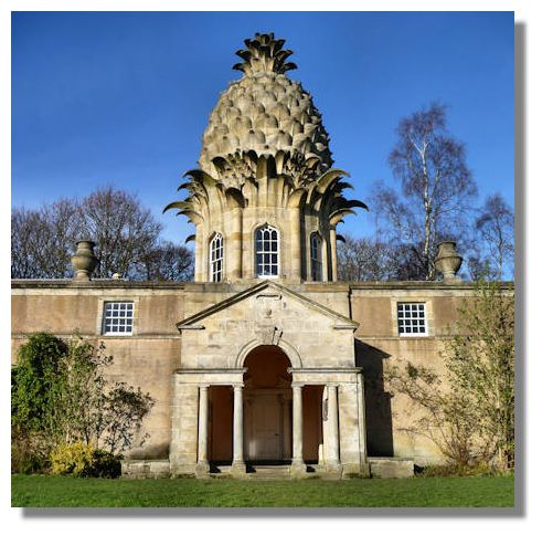 Described as the "most bizarre building in Scotland" this is a summer house built in 1761 with a first floor of cantilevered masonry in the shape of a realistic, prickly pineapple which is 45 feet high. It was built at a time when pineapples were relatively unknown in Scotland. Four chimneys are disguised as stone vases on top of an adjoining wall, because the summer house was heated by a furnace which circulated hot air through cavities in the wall. There are 16 acres of gardens with an orchard and the property has been restored by the National Trust for Scotland - and can be rented as a holiday home!