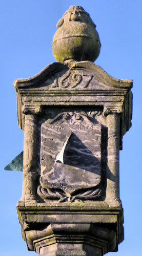 The market cross at Airth was erected by a Charles Elphinston in 1697. His initials and coat of arms and those of his mother and father with their arms quartered are on two sides of the cross. Unusually for a market cross, the other two sides of the cross are sun dials and one of them (seen here) has the date 1697. Quite apart from the inaccuracy of sun-dials, you would need very good eyesight to read the numbers at the top of the tall cross from the street below. Charles Elphinston was killed in a duel with a relative, Captain William Bruce of Auchenbowie at Torwood. These days, there is an Elphinstone Inn, adjacent to the market cross.