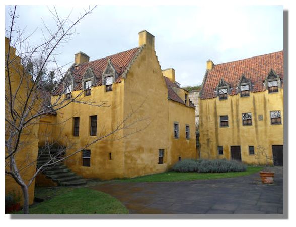 The "Palace" in Culross (illustrated here) is not associated with royalty but was built for Sir George Bruce, a wealthy merchant and industrialist, in the 17th century. The Palace is particularly attractive both because of the painted wooden ceilings and as the National Trust have filled it with furniture of the 17th and 18th centuries. The building facing the camera was originally an unpretentious late 16th-century dwelling house. George Bruce's initials are carved above one of the windows with the date 1597. A later building, dated 1611 has the initials "SGB" as by that time he was Sir George Bruce! He built the first coal mine in the world to extend under the sea at Culross.
