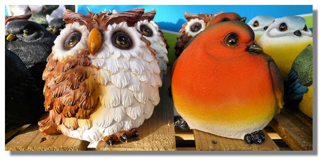 This amusing picture of models of a stylised owl and robin was taken in Toward Garden Centre, on the way to Airth and Culross. The expressions on their faces (and that of a fierce-looking blackbird behind) certainly made the customers smile!If you want to look back at earlier editions of this Colour Supplement, there is an Index Page