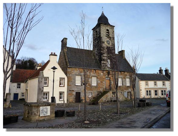 On the other side of the river Forth from Airth, and slightly further downstream in Fife, is the ancient town of Culross (pronounced "Coo-ross"), an almost perfect example of an ancient Scottish burgh of the 17th and 18th centuries. Many of the houses are of that period and the crows' feet gables, pantile roofs and narrow cobbled streets are typical of that time. A number of the buildings are now owned by the National Trust for Scotland including this fine Town House or "Tolbooth" dating from 1626. It was formerly used as a courthouse and prison.