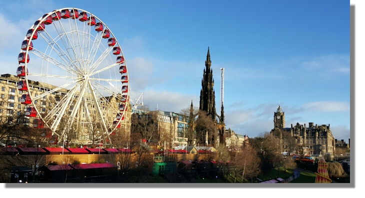 Although the decorations and entertainments such as the Ferris Wheel, "Star Flyer" skating rink and Merry-go-round and the Balmoral Hotel (on the right) are all seen at their best lit up at night, they still make an impressive picture during the day - especially when the sun comes out as it did here. The statue of Sir Walter Scott underneath his monument studiously ignores all the activities of course! The chairs of the "Star Flyer" are 60 metres (nearly 200 feet above the ground and fly around at around same height as top of the nearby Scott Monument.