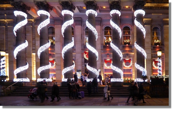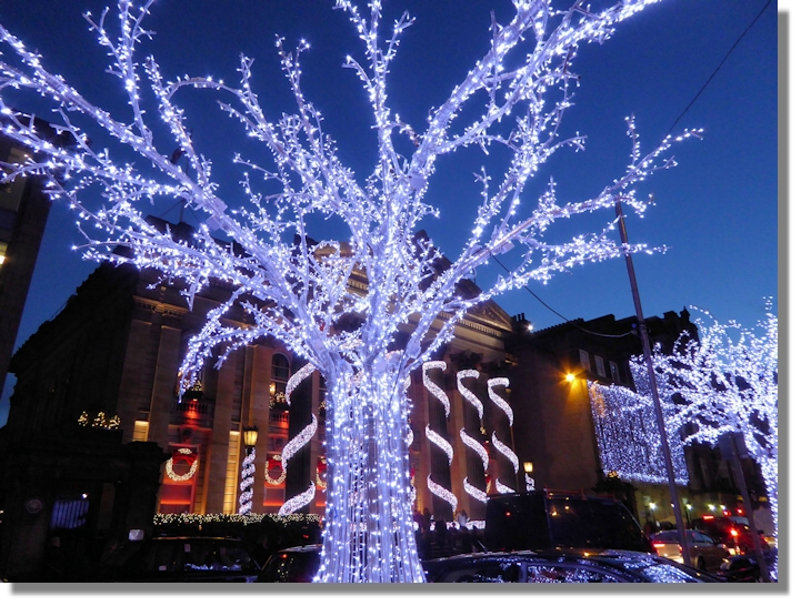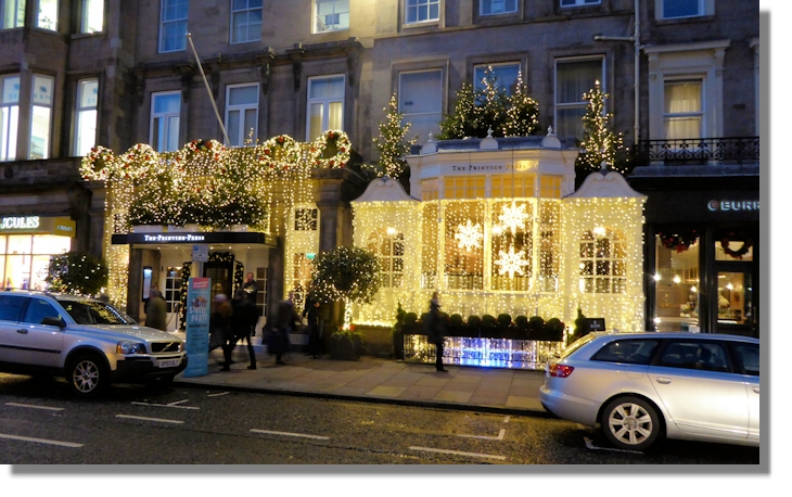 The Christmas lights are not confined to Princes Street and George Street, linking St Andrews and Charlotte Square and parallel to Princes Street puts on a good show as well, if a little more restrained as befits this street of impressive Georgian buildings. The trees are of course artificial and just provide a support for the lighting display. Behind, the "Dome" restaurant is also visible in this picture (more on that below).