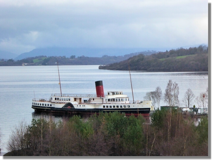 My two grandsons and their parents were up from their home in the south of England for Hogmanay and the first few days of the New Year. Of course the lively children (aged 5½ and not yet 3) needed entertained and on the 2nd of January many of the usual facilities were closed so we went to Loch Lomond Shores and the "Sealife" aquarium which was open that day. This picture shows the loch with Ben Lomond shrouded in mist (though the day was thankfully largely clear of rain). The paddle steamer "Maid of the Loch" has been moored at nearby Balloch for since the early 1990s. The vessel was the last paddle steamer built in Britain (in 1953) and operated on Loch Lomond for 29 years - I can recall as a youngster not much older than my grandsons going on a trip up Loch Lomond and being impressed by the noise and power of the engine turning those large paddles.