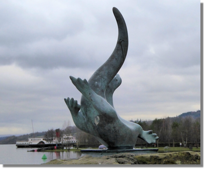 This sculpture of an otter is appropriately located outside the "Sealife" aquarium which fills the Drumkinnon Tower which includes a large family of real otters which entertain the visitors, especially at meal times.