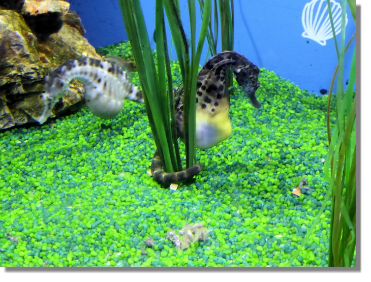 Sealife is justifiably proud of their sea horse breeding programme. A member of staff was on hand to explain that the male seahorse is equipped with a pouch on the front-facing, side of the tail. When mating, the female seahorse deposits up to 1,500 eggs in the male's pouch. The male then carries the eggs for 9 to 45 days until the seahorses emerge, fully developed, but very small. Once the young are released into the water, the male's role is done.