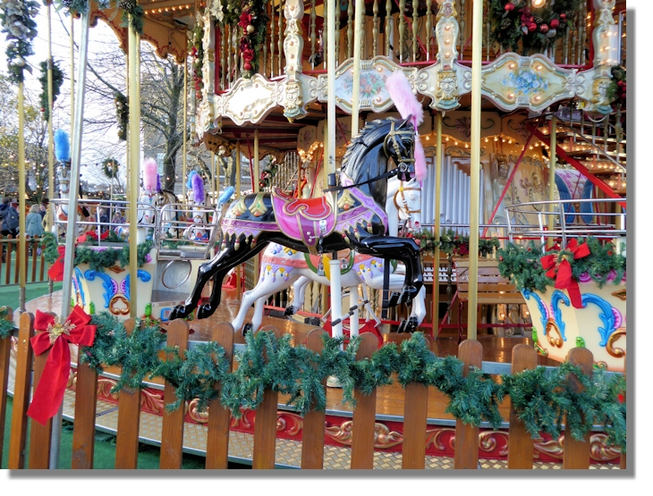 This picture of the merry-go-round was taken around lunchtime and the ride was not very busy. But later in the evening it was full of youngsters and adults enjoying the traditional whirling round and the loud fair-ground music filling the air and creating the right atmosphere.