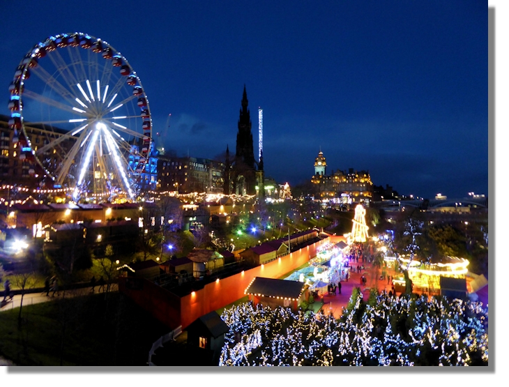 Here's Princes Street lit up at night, soon after sunset. The lights of Ferris wheel, Star Flyer, Balmoral Hotel and the children's play area contrast with the dark outline of the Scott Monument.