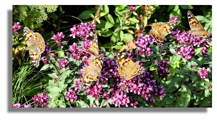 Although this diary page has a good number of graphics of Painted Ladies, I've also created a Windows Media Presentation with another ten graphics of Painted Lady butterflies (and a sound track, so make sure our speakers are turned on!). Most browsers should display the presentation correctly. If you want to download the slide show, just right click on the link and save or download to your PC. Likewise there is a brief (15 seconds) video showing the butterflies flitting around in some numbers on a marjoram plant and basking on a pathway.As the final slide says: "Roll on the next Painted Lady Year"!