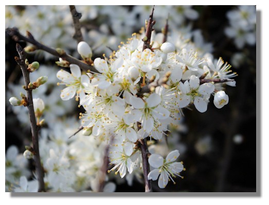 Blackthorn (Prunus spinosa or sloe) blossom appears before its leaves and can grow to be quite a sizeable tree. At this time of year the countryside is full of the bright, white flowers. It produces a fruit in autumn called "sloe", a small purple-blue berry. This can be harvested — traditionally, at least in the UK, in October or November after the first frosts.