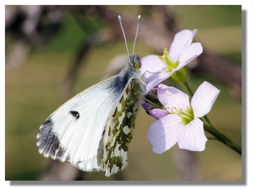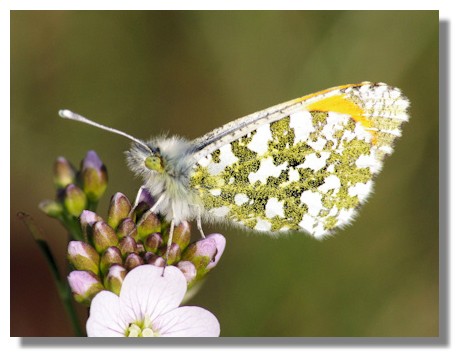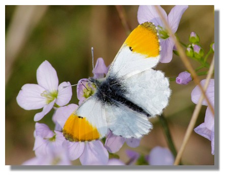Over the past 25/30 years there has been a rapid increase in the range of the Orange Tip in the UK - particularly in Scotland. It is now found in many parts of Scotland, as far north as Moray, flying along hedgerows and damp meadows, damp pastures and meadows, damp woodland edges and glades, riverbanks, ditches, dykes, fens, railway cuttings and country lanes. The Orange Tip is usually seen in damp grassy habitats where Cuckooflower (also known as Lady's Smock) the primary larvae food plant grows and along hedgerows where Garlic or Hedge Mustard is found.