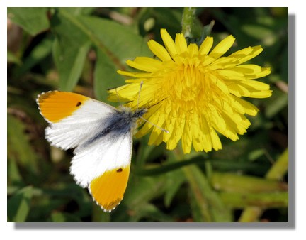 The male Orange Tips usually hatch out before the females. Since these butterflies will only live for a few weeks on the wing, they really have to get a move on to mate to make sure the eggs for the next generation are laid in a suitable spot for the larva to hatch and feed before starting the cycle over again next spring.