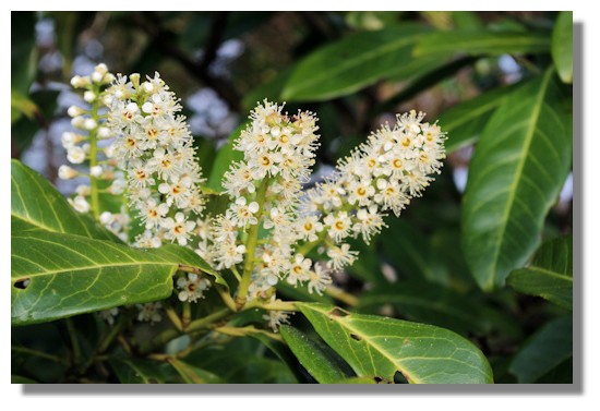 The Cherry Laurel (sometimes known as English Laurel in North America) has dark, evergreen leaves and these flower spikes burst into bloom at this time of year. In the autumn, the seeds which are contained within its berries are poisonous like the rest of the plant.