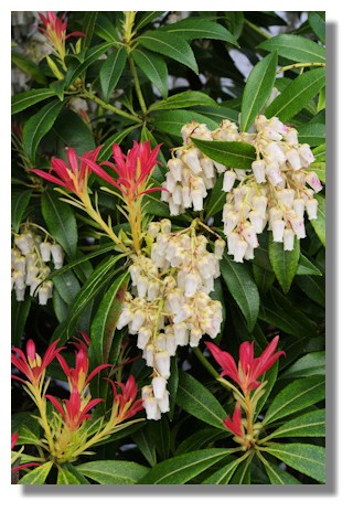 When this pieris was first planted in my garden it was probably no more than one or two feet tall. Over the years it has produced these bright pink new leaves and cascades of these white bell-shaped flowers. But the new growth is now about fifteen feet above the ground!